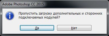Запустите Photoshop, удерживая нажатой клавишу Shift. При запуске отобразится диалоговое окно с запросом Пропустить загрузку дополнительных и сторонних подключаемых модулей?