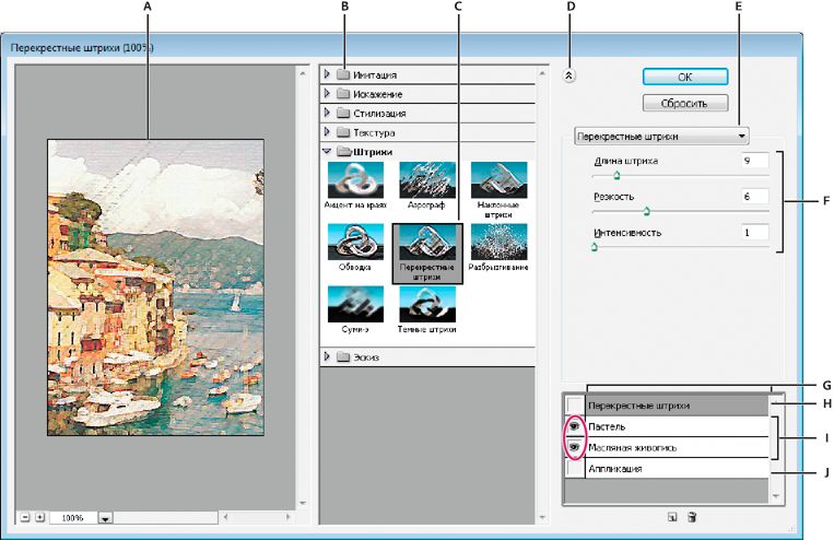A. Просмотр B. Категория фильтра C. Миниатюра выбранного фильтра D. «Показать/Скрыть» миниатюры фильтра E. Всплывающее меню «Фильтры» F. Параметры для выбранного фильтра G. Список эффектов фильтра, доступных для применения или упорядочивания H. Эффект фильтра выбран, но не применен I. Результат применения фильтров принят кумулятивно, но не выбран J. Скрытый эффект фильтра