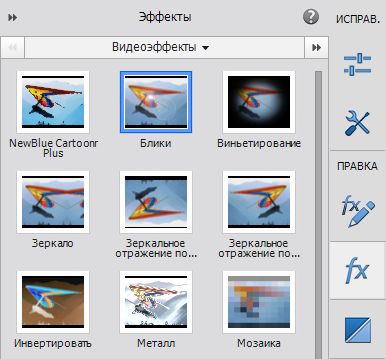 На панели «Эффекты» перетащите на клип эффект (например, «Блики»), чтобы применить.