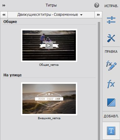 На панели «Титры и текст» выберите нужную категорию из списка «Движущиеся титры», выберите тему, а затем шаблон.