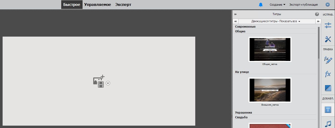 Содержит предварительно отформатированные шаблоны титров, которые можно использовать в фильмах. Контекстный элемент управления «Титры» появляется автоматически, когда к фильму в первый раз применяются титры. Используйте его для изменения свойств титров. Чтобы вызвать контекстный элемент управления «Титры» в дальнейшем, дважды щелкните титры. В режиме расширенного редактирования представлено больше шаблонов титров, чем в режиме быстрого редактирования. Дополнительные сведения см. в разделе Создание титров.