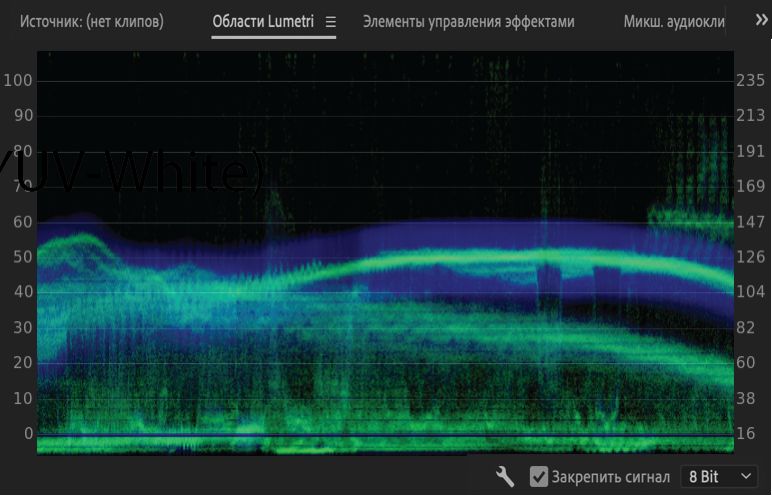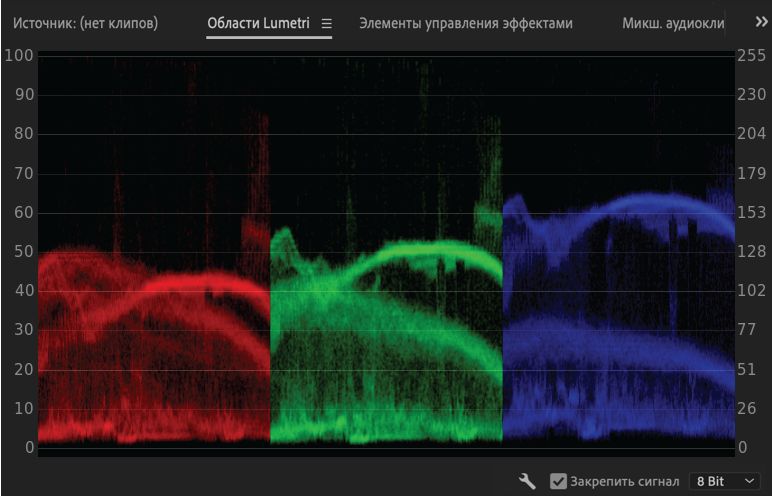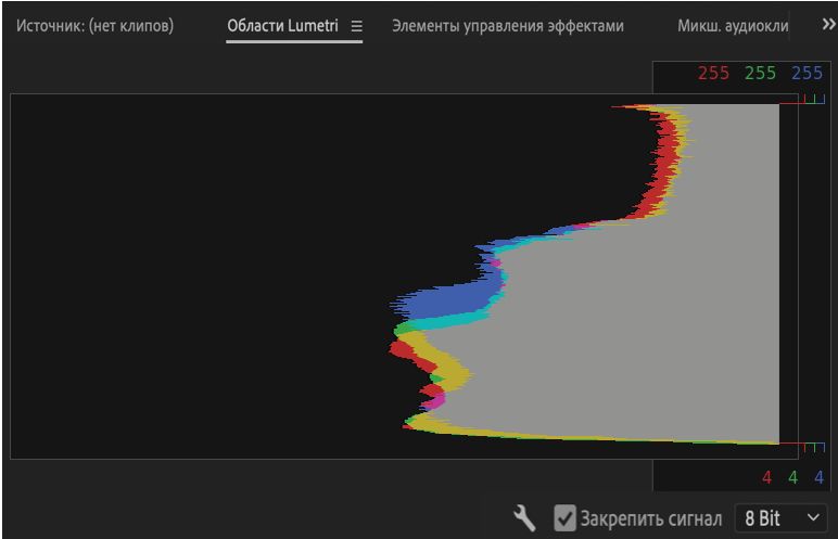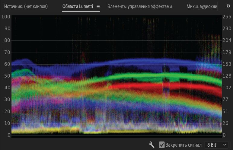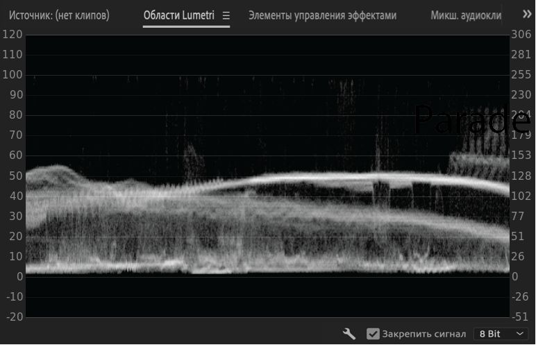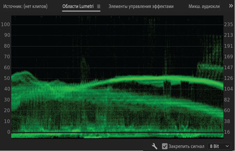 Выберите Фиксация сигнала при необходимости нормализировать любой сигнал свыше 100 IRE или ниже 0 IRE, отображаемый в областях. Фиксация сигнала влияет только на выход в окне Области Lumetri .Фиксация области не влияет на кадр, который рендерится на таймлайне, или на вывод экспорта.