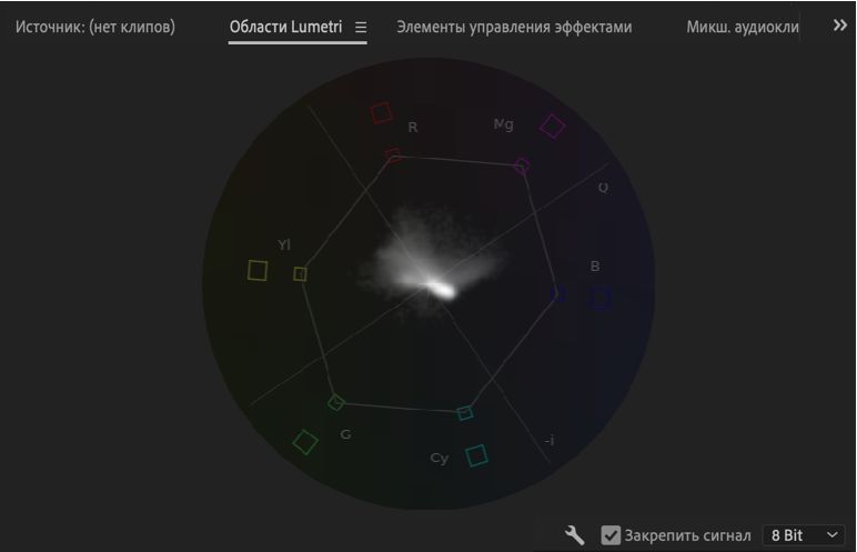 В Premiere доступно две разные версии вектороскопов: YUV и HLS (оттенок, яркость и насыщенность).
