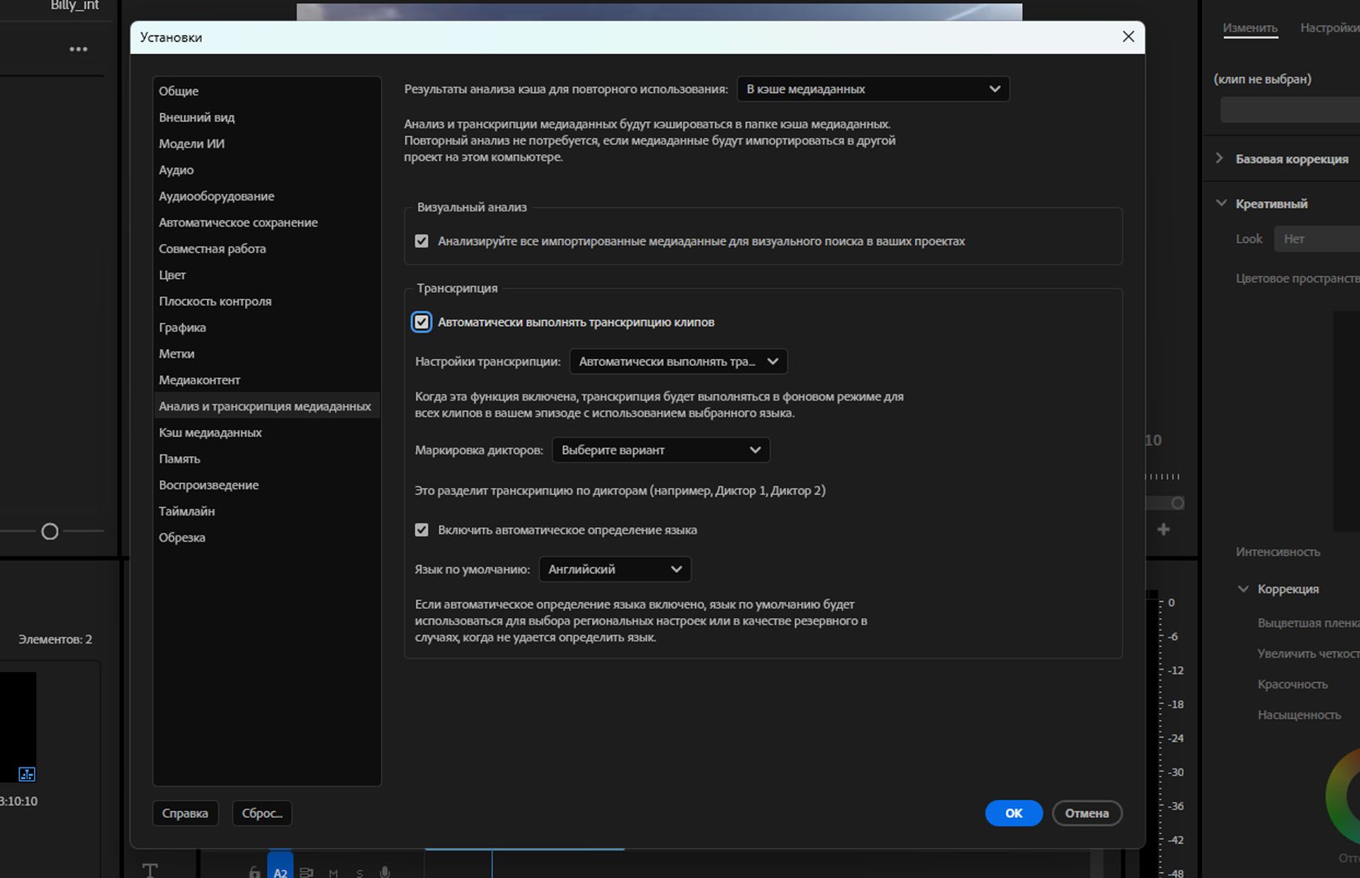 В новом разделе настроек Анализ и транскрипция медиаданных есть уже имеющиеся параметры Транскрипция, а также несколько новых настроек для управления анализом.