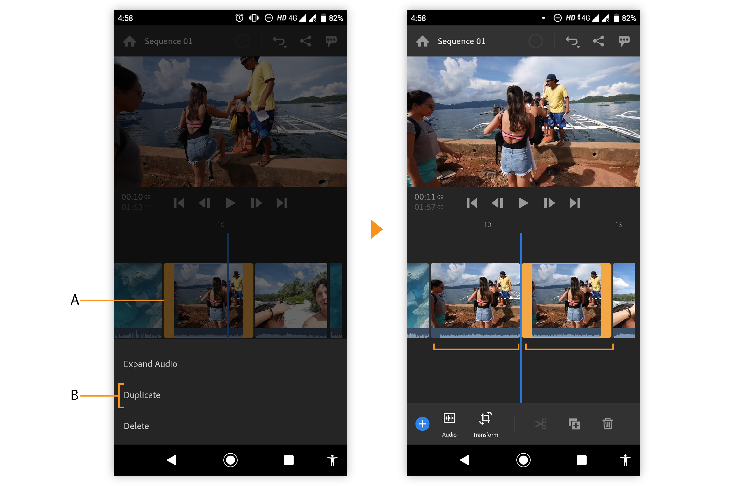 Чтобы отрегулировать продолжительность перехода, используйте ползунок длительности или нажмите переход на таймлайне, чтобы отобразить оранжевые метки, которые можно перетаскивать в разные стороны для изменения продолжительности перехода.