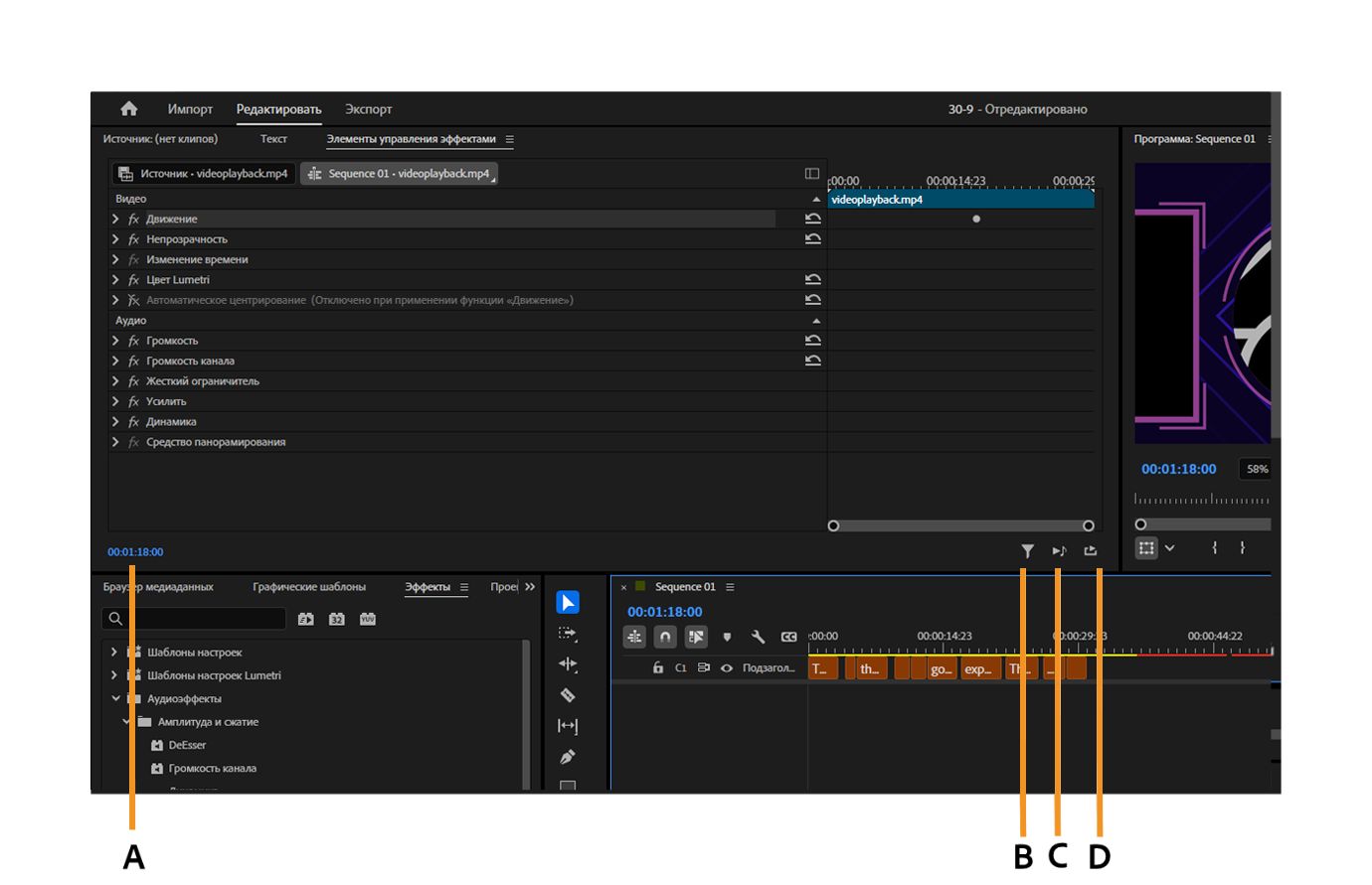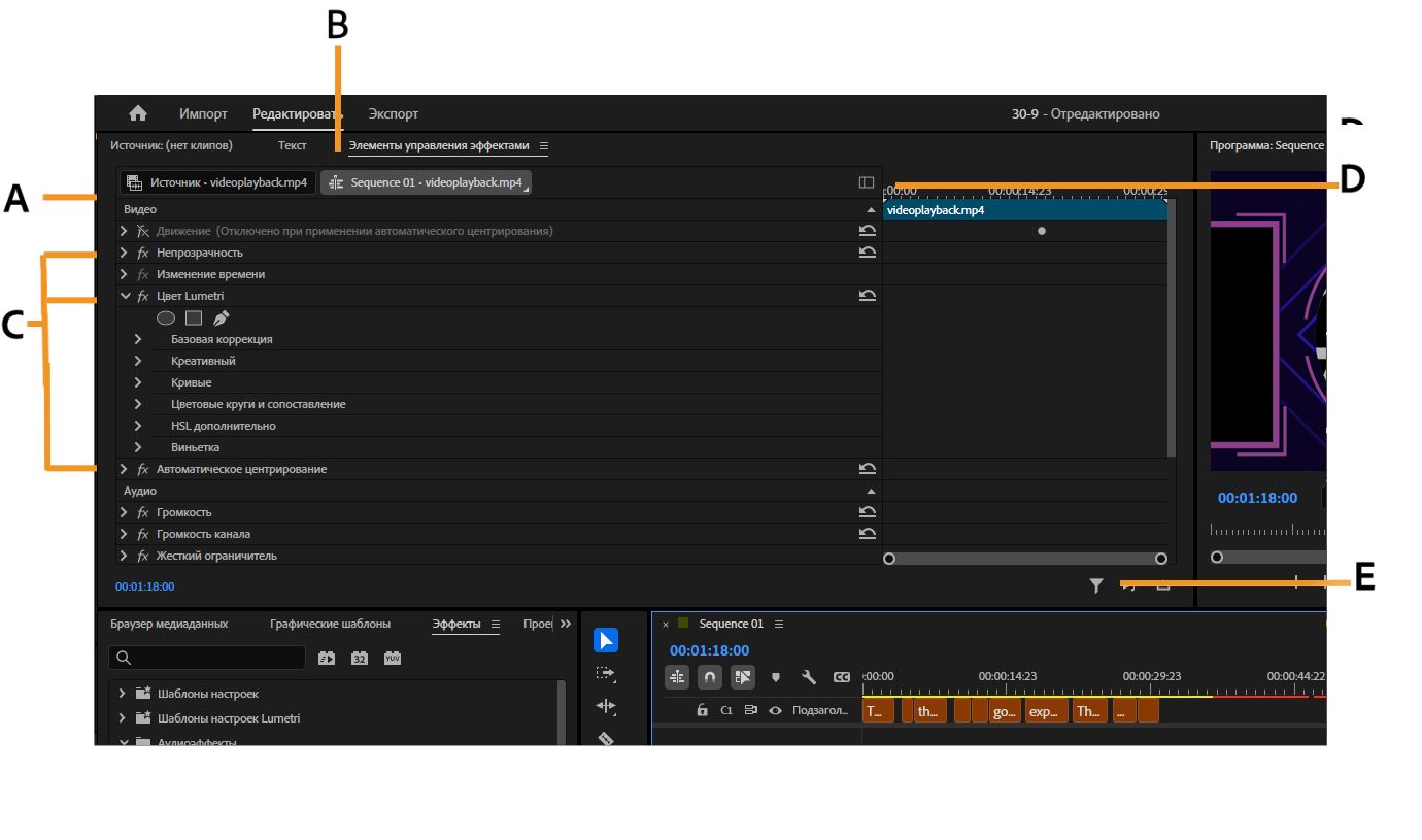 A. Имя последовательности B. Имя клипа C.Эффекты D. Показать/скрыть представление временной шкалы E.. Параметр свойств фильтра