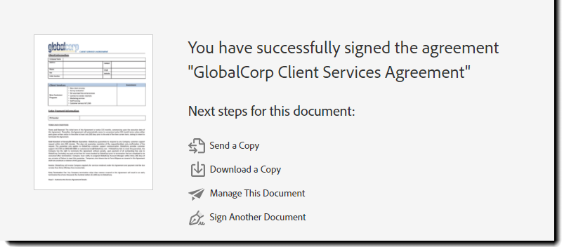 Эта страница содержит миниатюру документа, который только что был подписан (слева), и четыре «следующих шага», доступных для выбора: