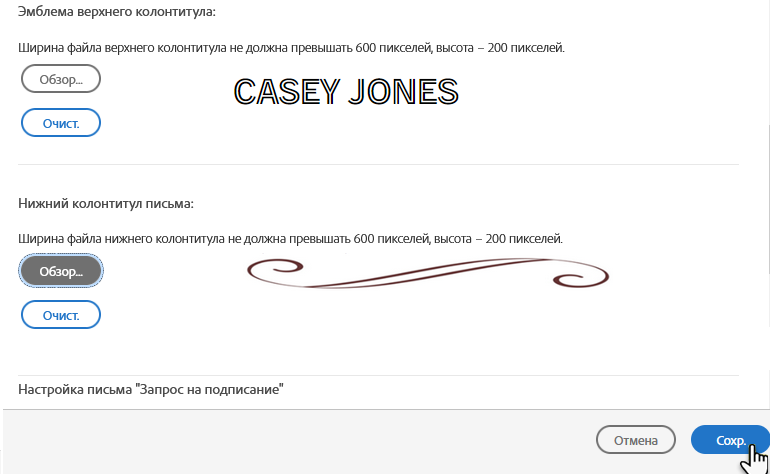На уровнях обслуживания «Бизнес» и «Организация» можно отправлять изображения верхнего и нижнего колонтитула для дальнейшей персонализации или добавления фирменной символики в вашу учетную запись. Эти изображения включаются в сообщения электронной почты, отправляемые получателям.