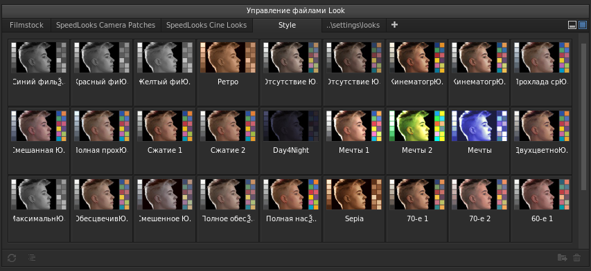Файл Look отображается в браузере Look в виде миниатюры. По умолчанию файлы сохраняются в расположение ../SpeedGrade/settings/looks.