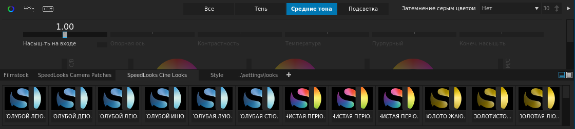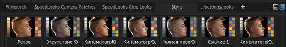 SpeedGrade предлагает множество шаблонов цветовых настроек Look, которые можно использовать при обработке медиафайлов. Они представлены в разделе SpeedLooks Cinelooks на вкладке Look.