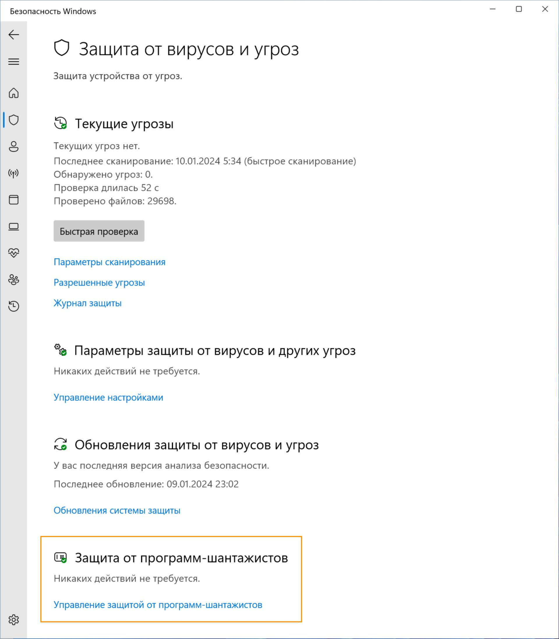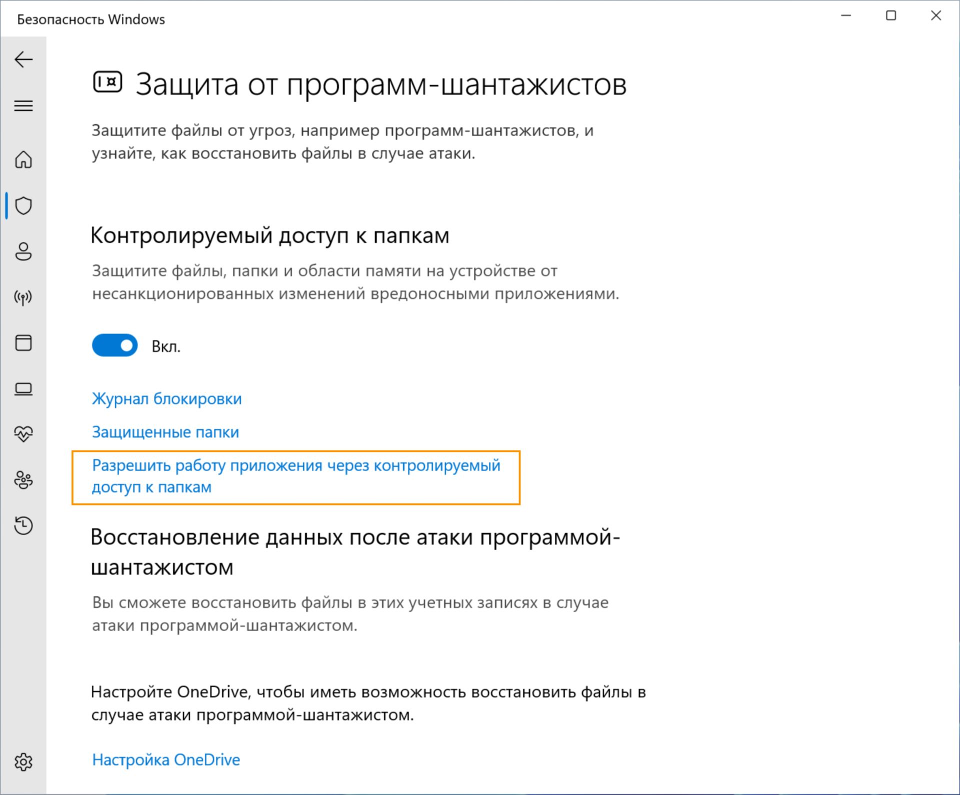В настройках защиты от вирусов и угроз выберите Защита от программ-шантажистов.