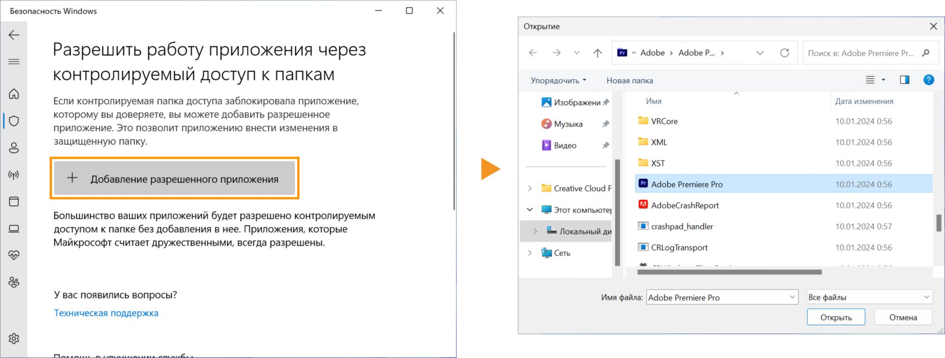 Чтобы запустить Premiere Pro, Adobe Media Encoder или After Effects, когда функция Контролируемый доступ к папкам включена, выполните следующие действия: