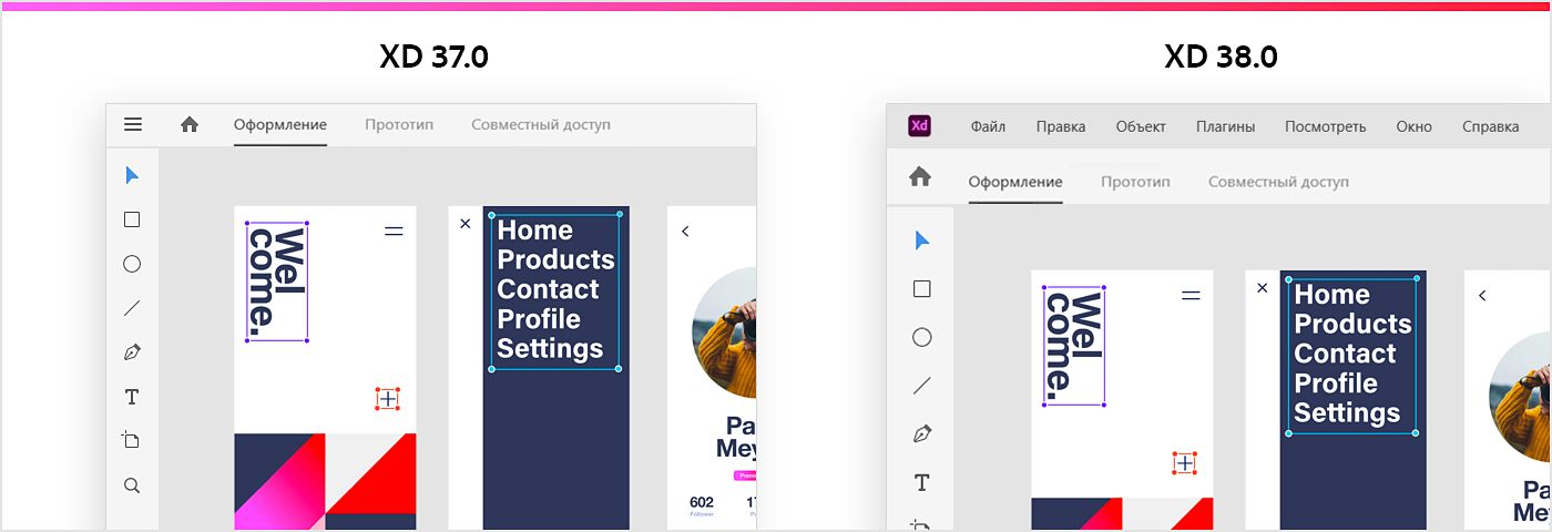 Теперь вы можете просматривать строку меню в верхней части кадра в версии XD для Windows. Меню в стиле «гамбургер» было заменено обновленной строкой меню приложения.