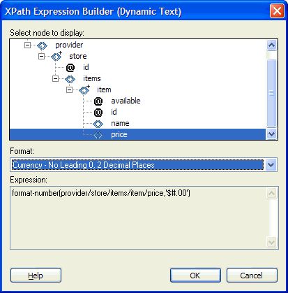 تنسيق العنصر الفرعي للسعر كعملة بموضعين عشريين تنسيق العنصر الفرعي للسعر كعملة بموضعين عشريين تقوم هذه الخيارات بإدراج التعليمة البرمجية التالية في صفحة XSLT:<xsl:value-of select="format-number(provider/store/items/item/price,'$#.00')"/>