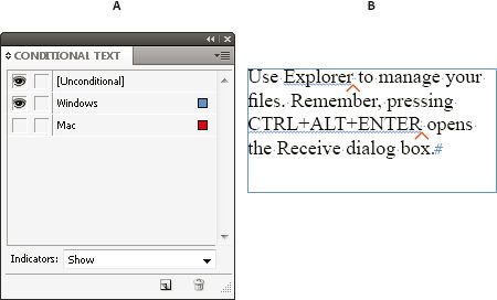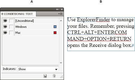 إن النص الشرطي هو طريقة لإنشاء إصدارات مختلفة من نفس المستند. بعد أن تقوم بإنشاء الشروط، تقوم بتطبيقهم على نطاقات من النص. يمكنك عندئذ إنشاء إصدارات مختلفة من المستندات بشروط إظهار وإخفاء. على سبيل المثال، إذا كنت تقوم بإنشاء كتيب حاسب، يمكنك إنشاء شروط مستقلة لنظام تشغيل Mac OS و نظام تشغيل Windows. قبل أن تطبع إصدار Mac OS من دليل المستخدم، يمكنك إظهار كل النص المطبق عليه شرط "Mac" وإخفاء المطبق عليه شرط "Windows". يمكنك عندئذ عكس حالات الشروط لطباعة دليل المستخدم الخاص بنظام Windows.
