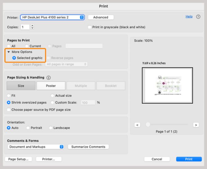 Välj Vald grafik i dialogrutan Skriv ut under avsnittet Utskriftsintervall > Fler alternativ.
