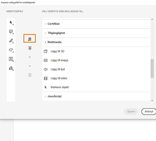 Verktygsfältet Anpassa snabbåtgärder öppnas.