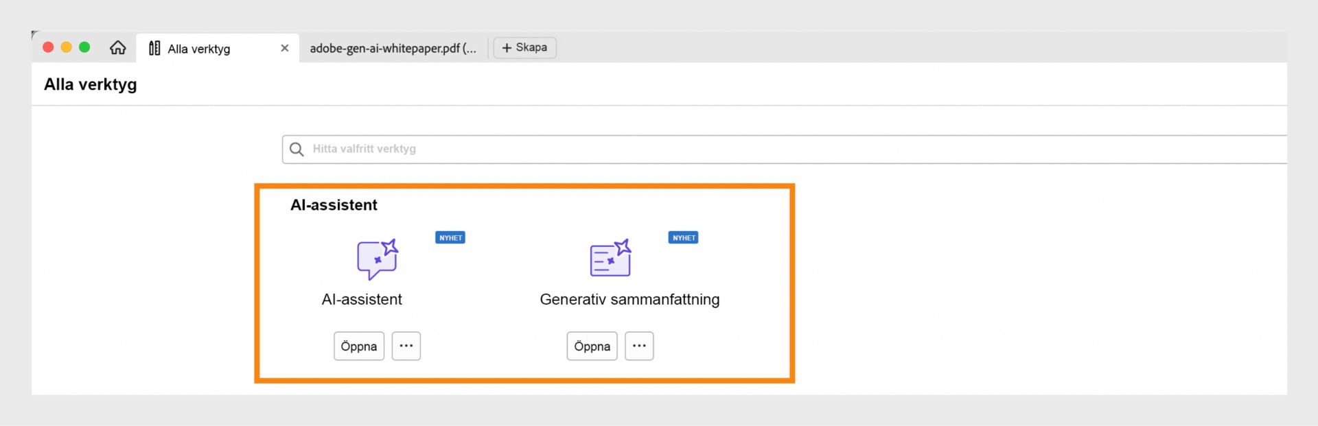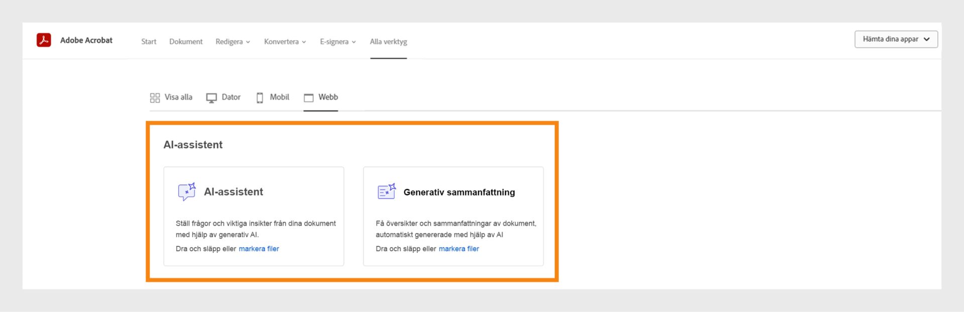 Alternativt kan du på Acrobat-startsidan klicka på Allaverktyg och sedan välja AI-assistent eller Generativ sammanfattning.