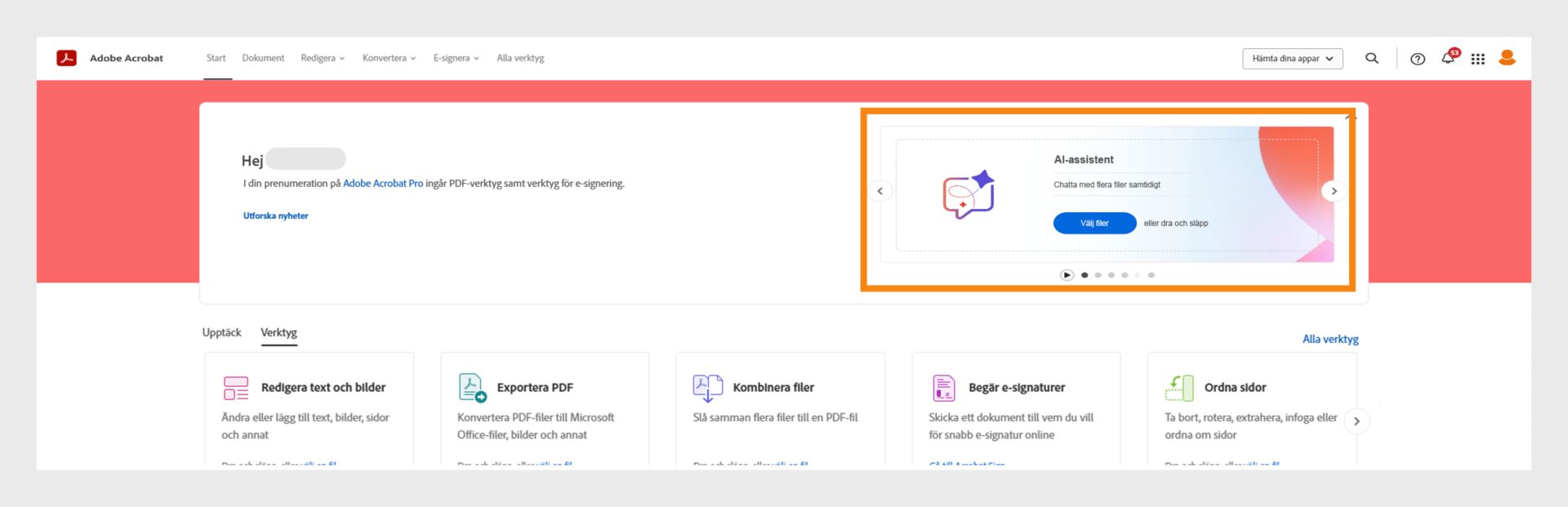 I Acrobat-startsidan, under avsnittet Rekommenderade verktyg för dig, kan du nu använda AI-assistenten för att interagera med dina dokument. Klicka på Välj filer och välj en eller flera filer för att starta en konversation med dina dokument och få insikter.