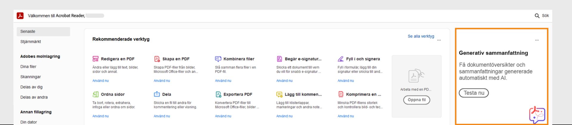 De generativa AI-funktionerna i Acrobat Reader lanseras stegvis och är inte tillgängliga för alla användare.