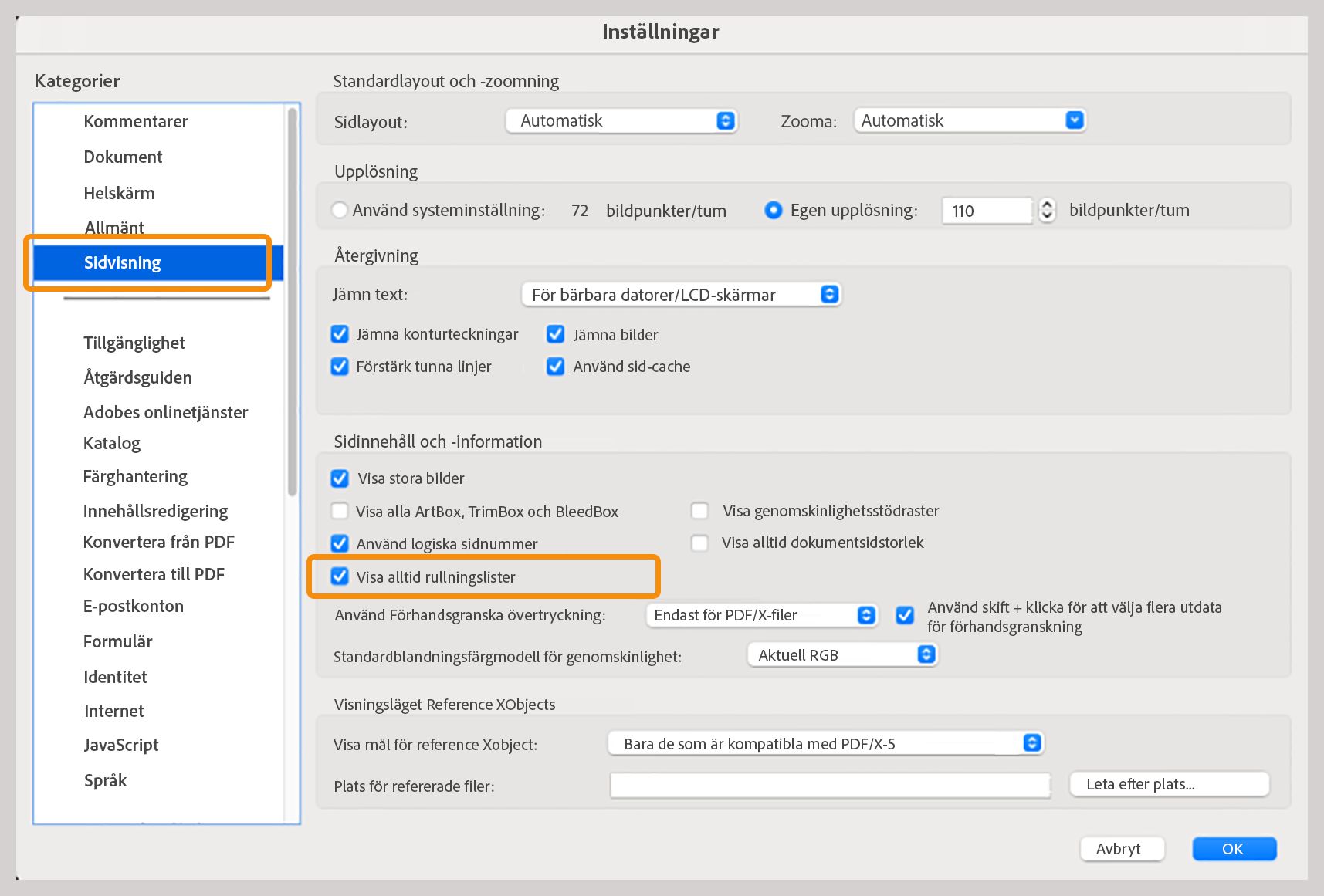 Du kan aktivera rullningslisten på följande sätt för att visa den enhetligt i Acrobat eller Acrobat Reader: