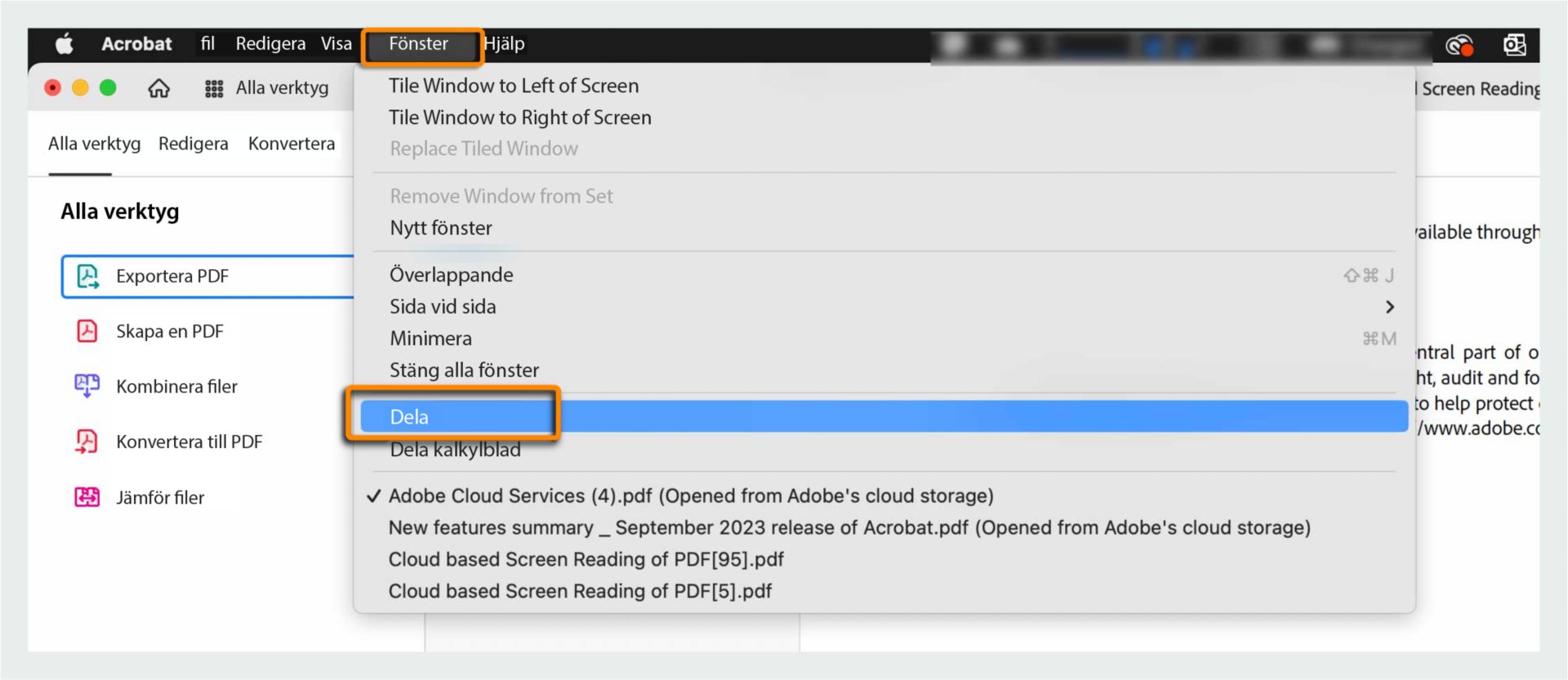 Uppdatering av delad vy: om du vill visa PDF-filen i delat läge går du till Windows® > Dela. Den tidigare metoden för att komma åt Dela från toppen av den vertikala skrollningslisten har upphört.