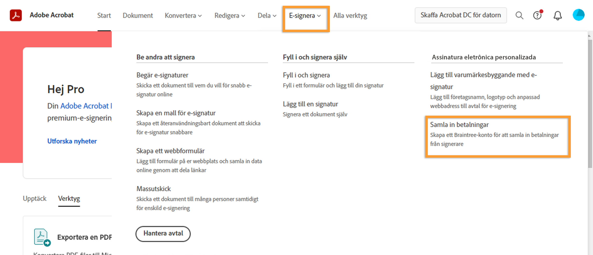 Adobe Acrobat Pro med onlinetjänster är den kompletta PDF-lösningen för att arbeta med dina viktigaste dokument på datorer, webben och mobila enheter. Uppdatera skrivbords- och mobilapparna för Acrobat eller logga in på Acrobat online för att uppleva de nya funktionerna och förbättringarna.