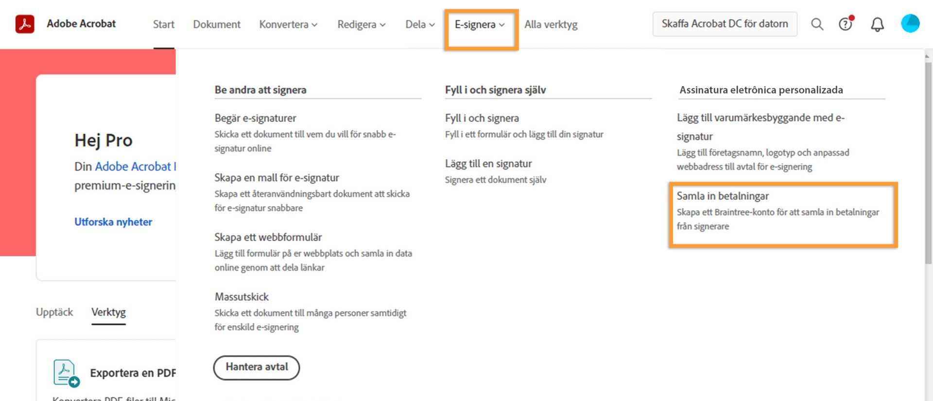 Det är nu möjligt att lägga till betalningsalternativ i e-signaturdokument. Du kan effektivisera uppgifter som att begära betalning vid registrering för ett evenemang, acceptera handpenningar på kontrakterade tjänster och mycket mer. Gå till E-signatur i Acrobat på webben och välj Samla in betalningar. Du hittar mer information i Samla in betalningar online.