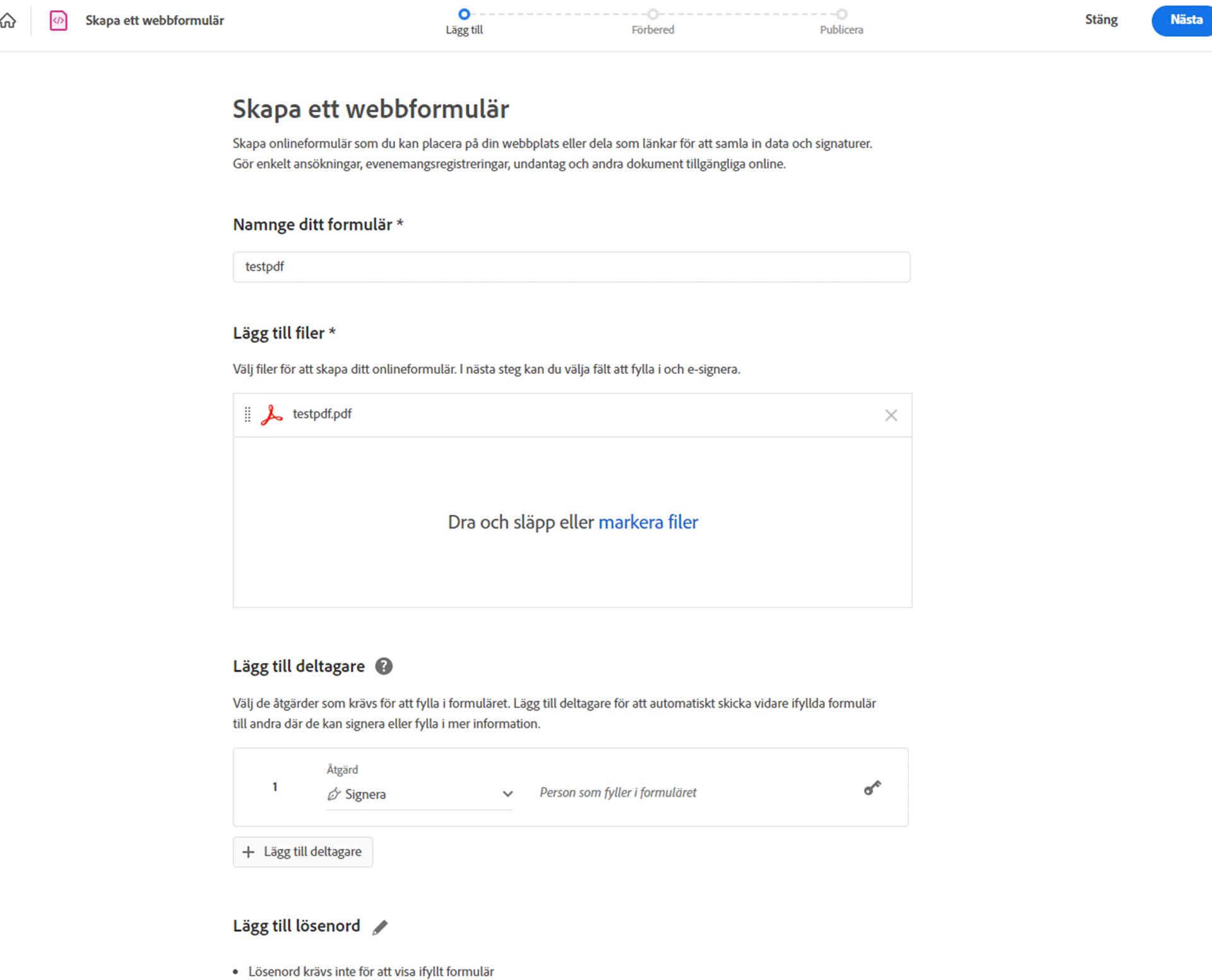 På sidan Skapa ett webbformulär fyller du i information såsom namnet på formuläret, lägger till deltagare och följer sedan stegen för att skapa ett webbformulär.