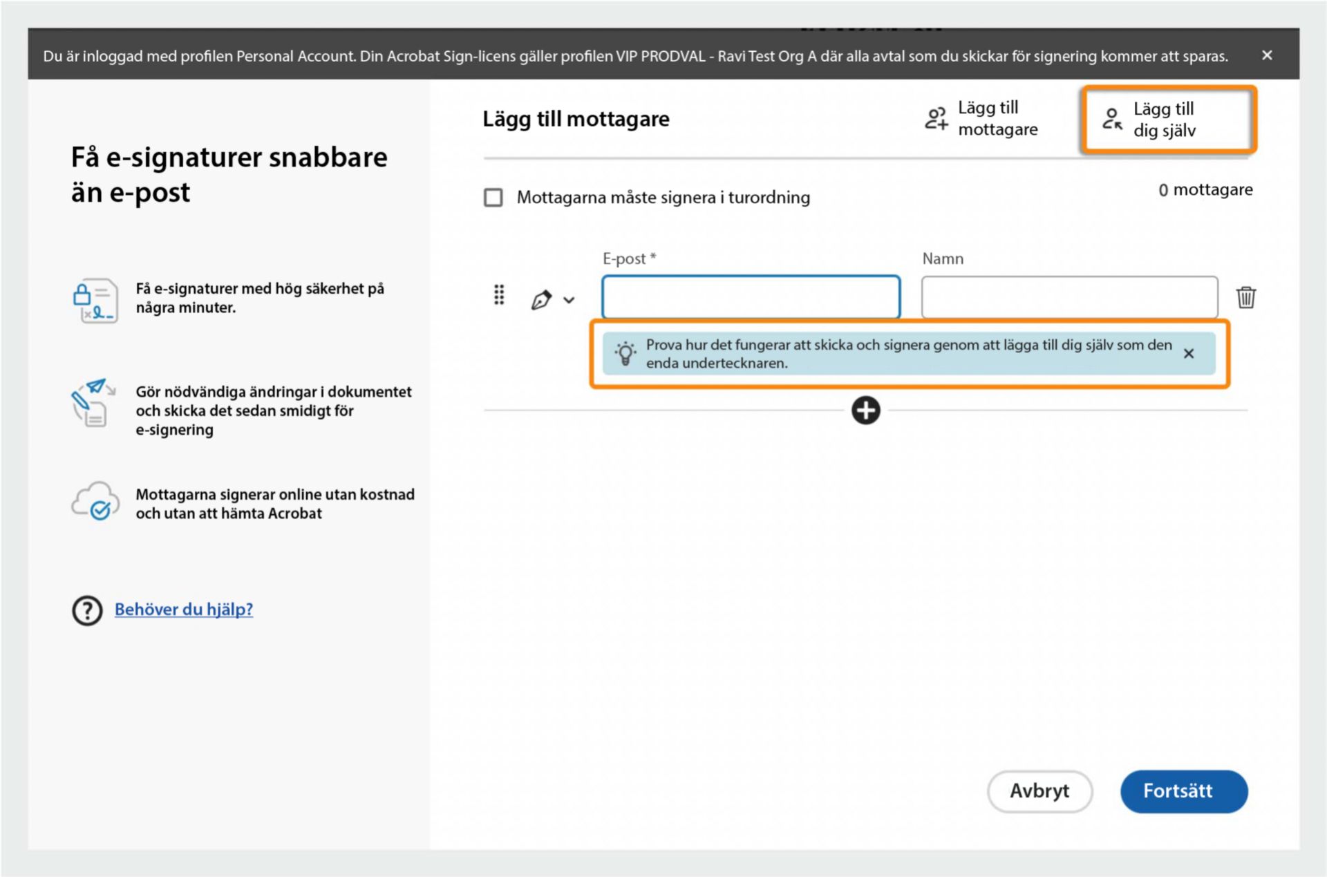 Nu kan du välja att inkludera dig själv som signerare av ett avtal. Acrobat uppmanar dig att utforska processen för att skicka och signera genom att göra dig själv till signerare.