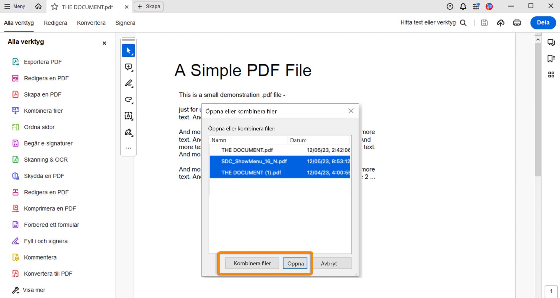 Du kan nu dra flera filer direkt till en PDF-fil för att kombinera dem i Acrobat. När du drar och släpper dessa filer visas dialogrutan Öppna eller kombinera filer och uppmanar dig att välja om du vill Öppna filerna eller Kombinera dem.