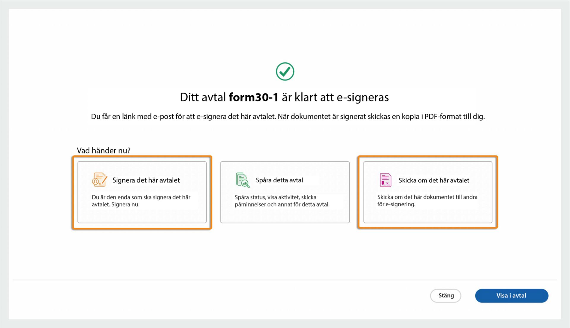 - Signera avtalet: välj det här alternativet om du vill signera avtalet själv eller om du vill visa mottagarens signeringsupplevelse.