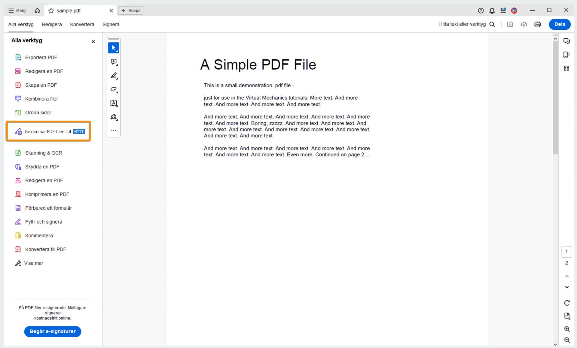 Öppna en PDF-fil och välj Alla verktyg > Stilisera denna PDF-fil.