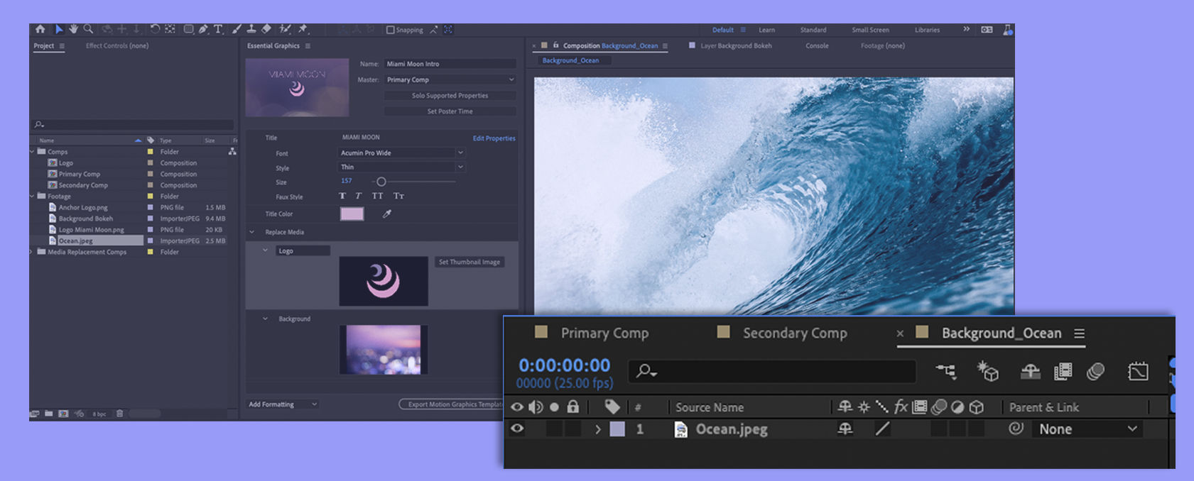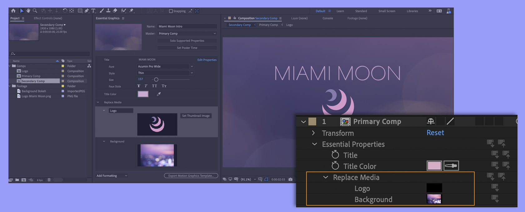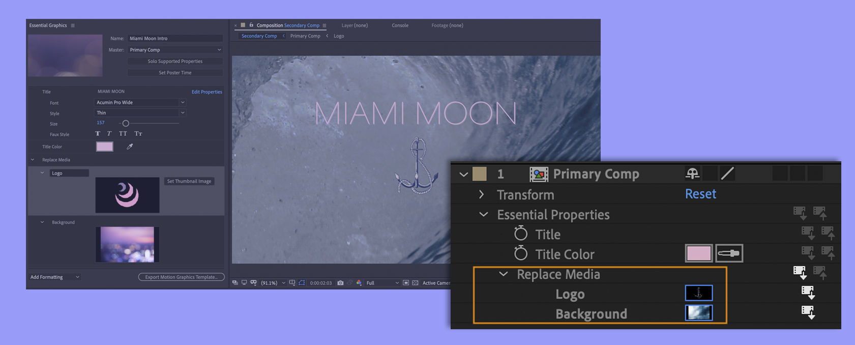 Learn how to create a Motion Graphics template with replaceable media and use media replacement with essential properties.