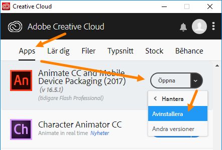 Använd Creative Cloud-datorprogrammet till att installera Animate på nytt.