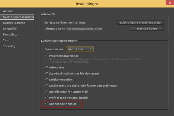 Du kan synkronisera anpassade penslar som du skapat med molnet via inställningarna för Animate. Det gör du genom att gå till Redigera > Inställningar i Windows eller Animate > Inställningar på Mac. Alternativet att synkronisera anpassade penslar i avsnittet Synkronisera inställningar visas nedan: