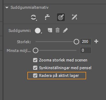 Du kan välja att använda suddgummit (E) för att endast radera på det aktiva lagret.