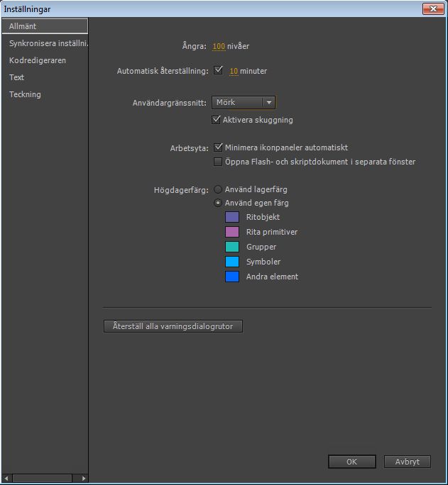 Om du vill att paneler i ikonläget ska minimeras automatiskt när du klickar utanför dem väljer du Minimera ikonpaneler automatiskt. Om du vill öppna ett separat fönster när du väljer Kontroll > Testa markerar du Öppna Flash- och skriptdokument i separata fönster. Som standard öppnas testfilmen i ett eget fönster.