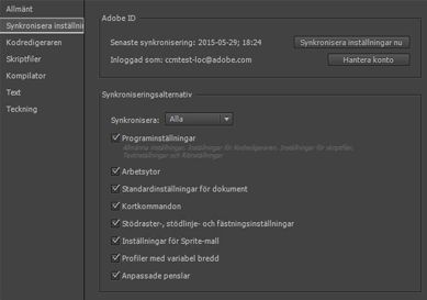 Detta visar de synkroniseringsalternativ som du angett mellan Flash och ditt Creative Cloud-konto. Du kan synkronisera programinställningar, arbetsytor, standardinställningar för dokument, kortkommandon, inställningar för stödraster, stödlinjer och fästning, inställningar för Sprite-mallar, profiler med variabel bredd och anpassade penslar.