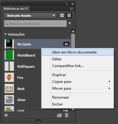 - Öppna i nytt dokument: Öppnar den markerade animeringen som ett nytt dokument. Du kan också dra och släppa animeringen på scenen.