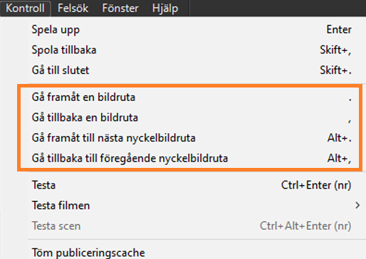 Du kan navigera mellan nyckelbildrutor på det aktiva lagret med menyn Kontroll. Du kan också använda Alt+. eller Alt+, för att gå framåt och bakåt till nästa eller föregående nyckelbildrutor på tidslinjen.