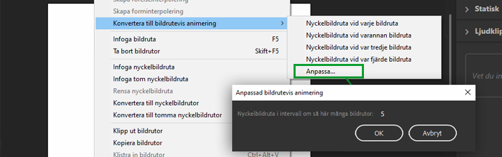 Alternativet Konvertera till bildrutevis animering finns i Ändra-menyn. Du kan också tilldela önskade kortkommandon för de här åtgärderna i dialogrutan för kortkommandon.