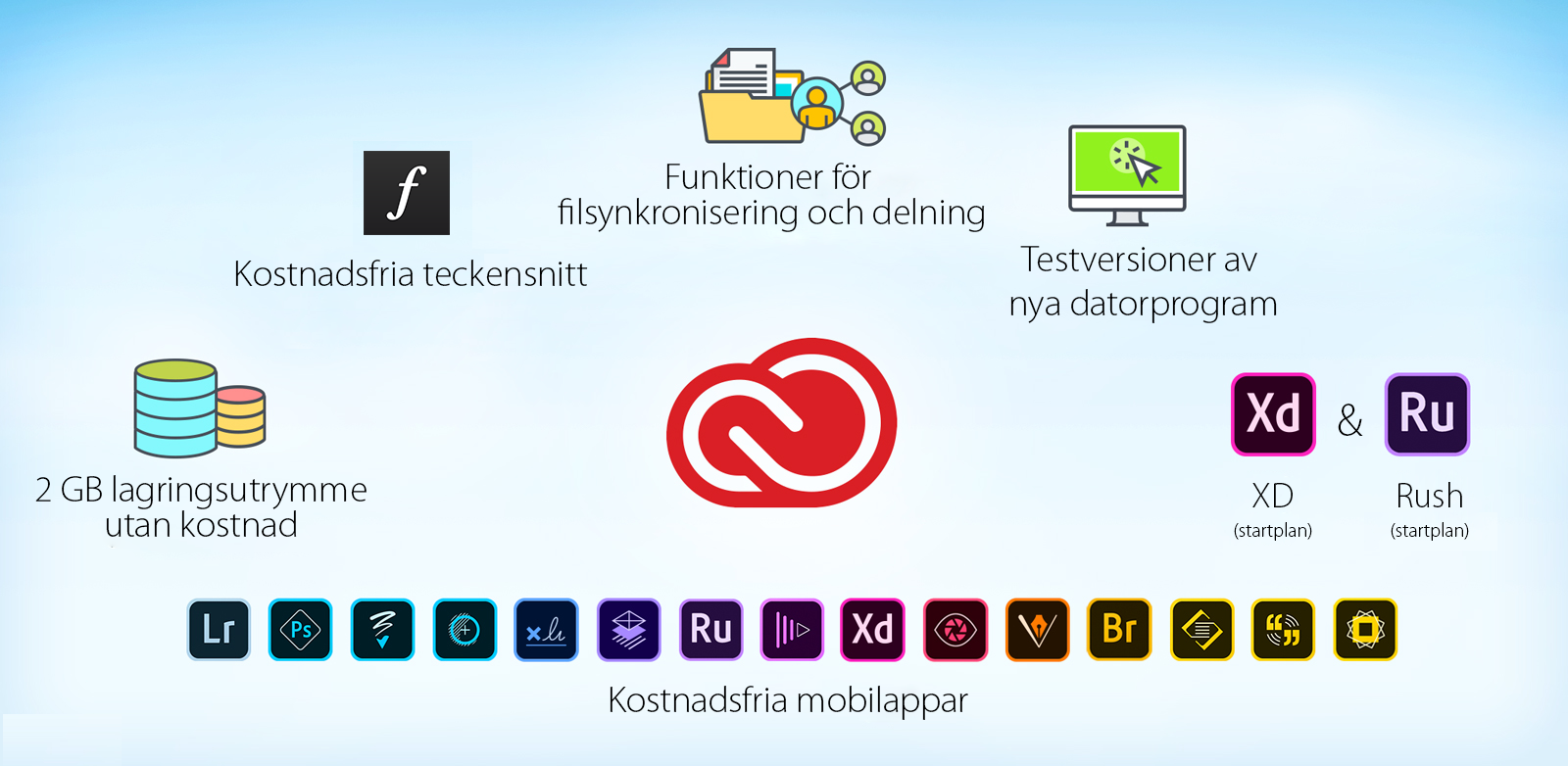 Adobe erbjuder dig ett kostnadsfritt Creative Cloud-medlemskap med en rad fördelar. Inget köp krävs för att registrera dig för ett kostnadsfritt medlemskap i Creative Cloud. Du kan skapa ett Adobe ID och få tillgång till kostnadsfria versioner av några av Adobes mest populära appar och tjänster. Med dessa kostnadsfria versioner av Adobes appar och tjänster kan du bli mer kreativ. Du kan även uppgradera till premiumversioner och bli ännu mer kreativ.