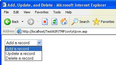 Varje menyval motsvarar ett hårdkodat värde som skickas som en formulärparameter till servern. Dialogrutan Listvärden i följande exempel matchar varje listpost med ett värde (Lägg till, Uppdatera eller Ta bort):