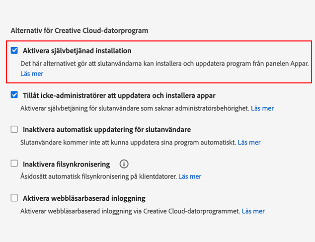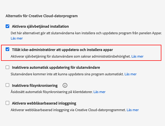- Du kan också välja alternativet Aktivera självbetjänad installation och inte välja alternativet Tillåt icke-administratörer att uppdatera och installera appar. I så fall kan bara användare som har administratörsbehörighet på sina datorer installera och uppdatera program.