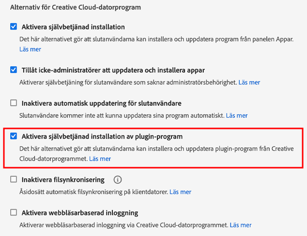 Som administratör kan du lägga till plugin-program i paketet när du skapar ett hanterat paket. Dessa plugin-program finns också i Creative Cloud-datorprogrammet. Använd alternativet Aktivera självbetjänad installation av plugin-program om du vill tillåta att användare installerar och uppdaterar plugin-program från Creative Cloud-datorprogrammet. Om du ändrar det här alternativet måste användarna avsluta och starta om, eller logga ut och logga in igen, i Creative Cloud-datorprogrammet för att ändringen ska visas.
