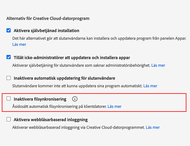 Som administratör kan du välja att inaktivera synkronisering av Creative Cloud-filer på slutanvändarnas datorer. Filsynkronisering är aktiverat som standard. Att inaktivera det här alternativet är dock praktiskt om du distribuerar paket i en testmiljö. Om du till exempel testar distributionsscenarier behöver du inte ett stort antal filer som ska synkroniseras mellan olika enheter.