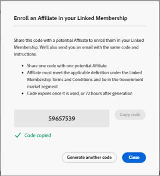 Efter att du har accepterat villkoren för det länkade medlemskapet är du redo att registrera anknutna. För att registrera en anknuten måste du generera en registreringskod och skicka den till den anknutna. Varje anknuten behöver en egen registreringskod.