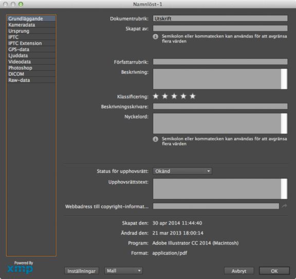 Dialogrutan Filinformation (Arkiv > Filinformation) har gjorts om med ett nyare ramverk. I skärmbilden nedan visas den nya layouten för dialogrutan Filinformation.