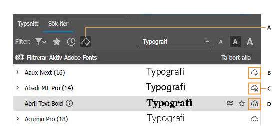 Visar alla teckensnitten som lagts till från Adobe Fonts. |